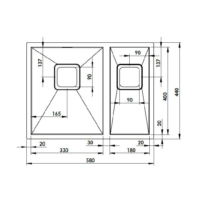 Chiuveta bucatarie din inox cu montare sub blat cu doua cuve Fabiano Quadro 58 R10 L Double
